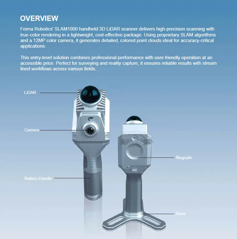 The SLAM1000 is a compact, cost-effective handheld 3D LiDAR scanner from Feima Robotics, designed to make high-quality reality capture more accessible. Combining a non-repetitive LiDAR sensor, integrated color camera, and precision SLAM processing, the system delivers reliable, colorized point cloud data in a lightweight, easy-to-deploy form factor.