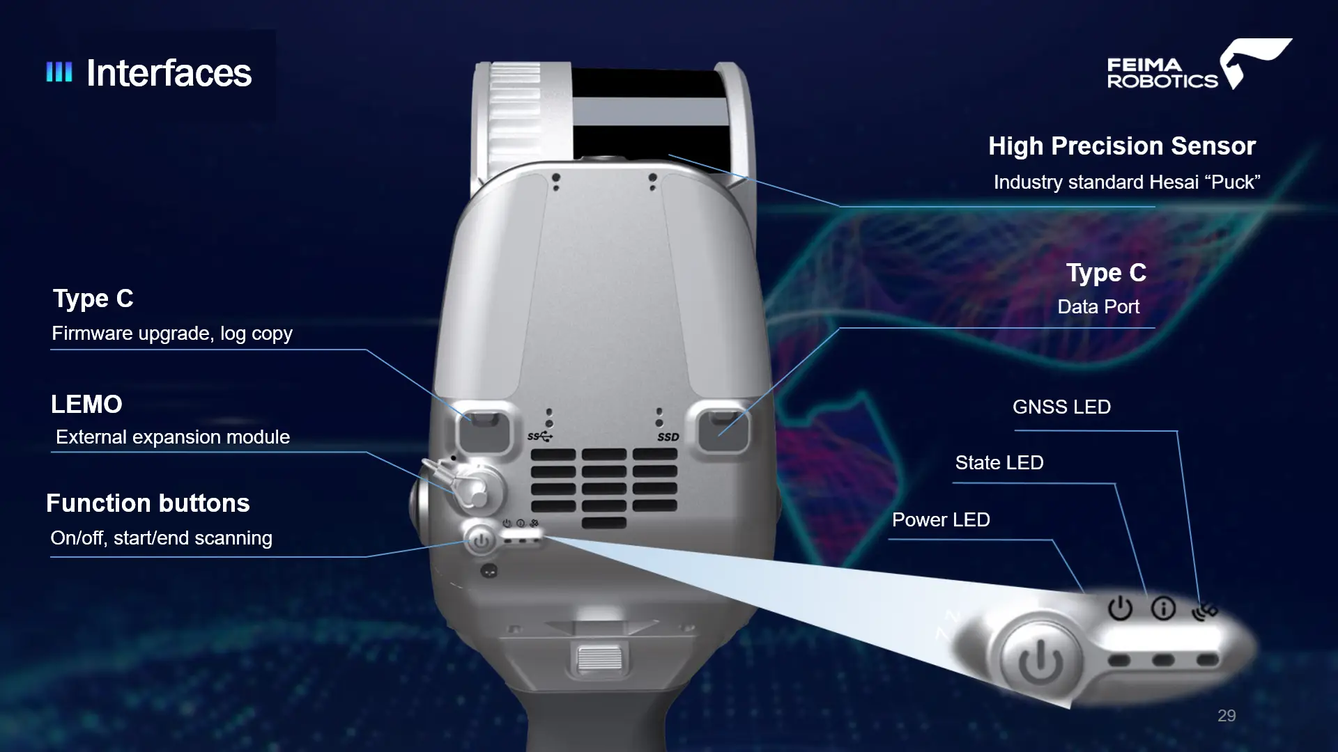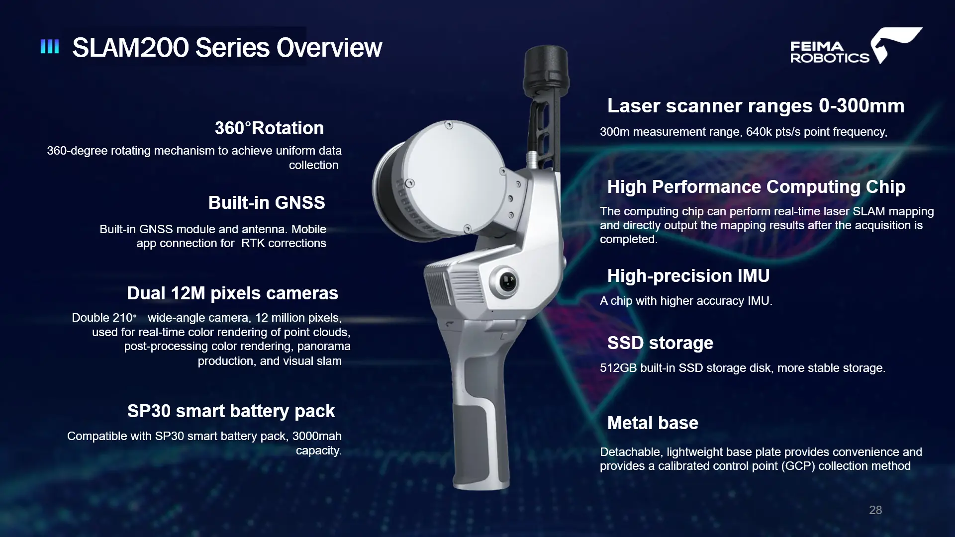 The SLAM200 Series is the third generation of high-precision handheld 3D LiDAR scanners developed by Feima Robotics. The platform integrates multi-channel laser sensors, dual 12 MP panoramic cameras, a built-in GNSS module, and an upgraded processing architecture to deliver reliable, high-quality spatial data capture across a wide range of environments.